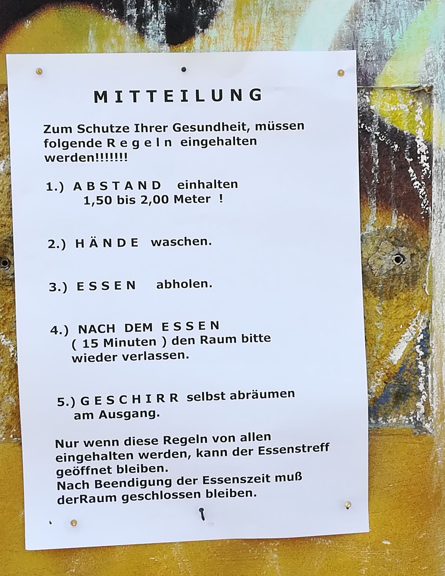 Beim Essenstreff in der Schwarzwaldstraße war viel los. Essen wurde ausgegeben. Auf Abstand wurde geachtet. Auch mich ermahnte eine Frau, die aus dem Fenster Essen reichte. Beim Versuch, mich nach Anna zu erkundigen, war ich jemandem in der Warteschlange zu nahe gerückt. Ein Glück, dass es nicht regnet!